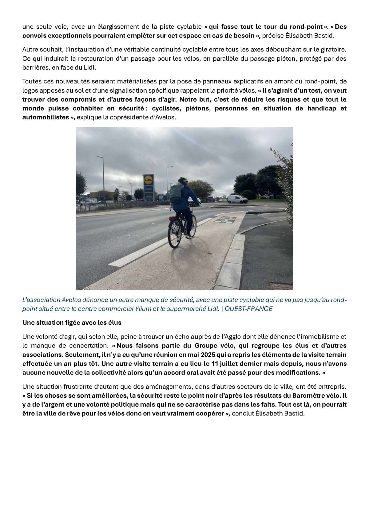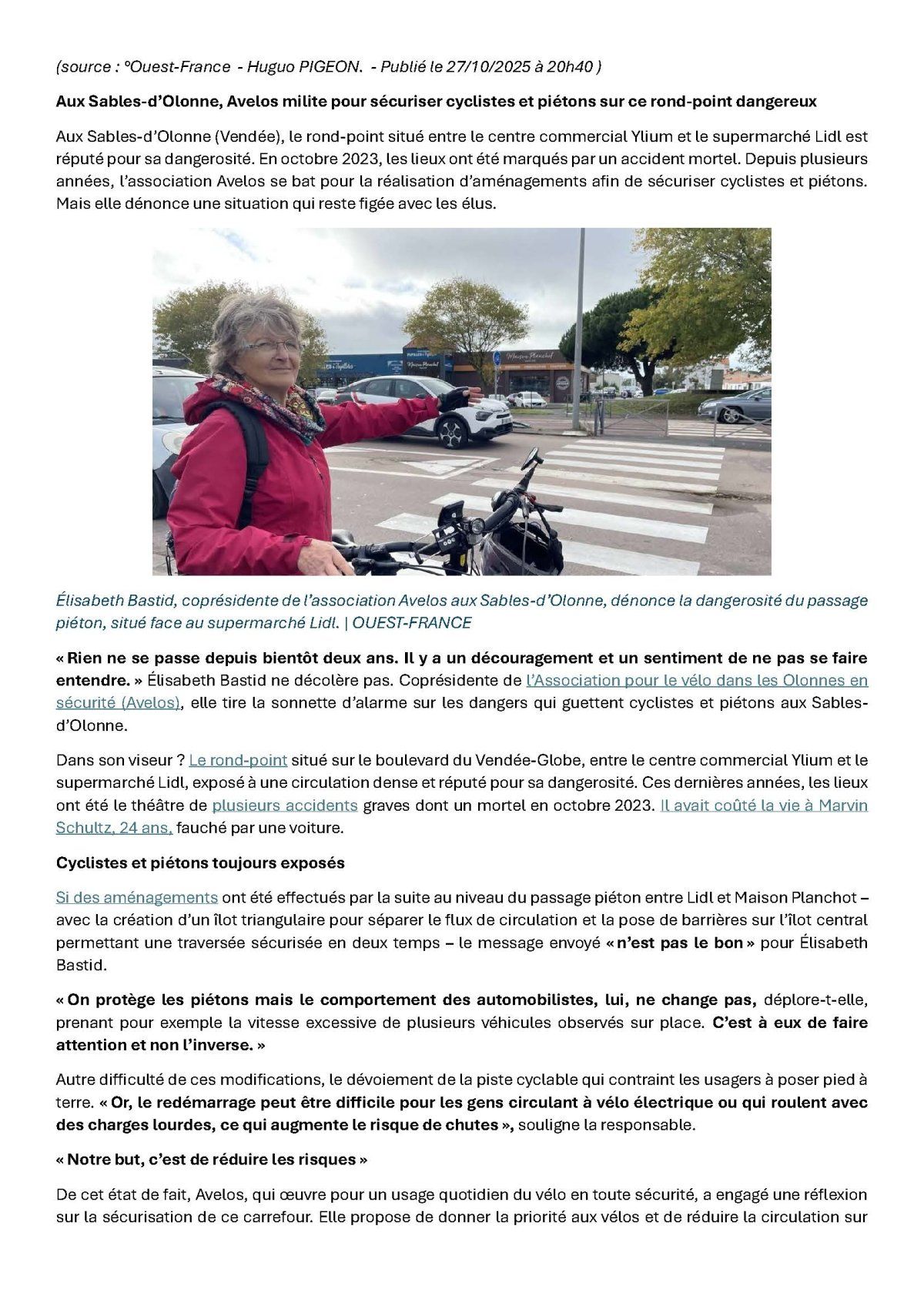 Certes, AVELOS ne partage pas les avis portés par certains témoignages de non adhérents (sont-ils même Sablais, ou bretons ?) dont les contre-références ne reflètent pas la réalité des pays de Loire où le dialogue entre Assos Vélos et Agglo (Elus et services techniques) produisent de vraies améliorations ce que nous espérons obtenir bientôt au Sables d'Olonne.