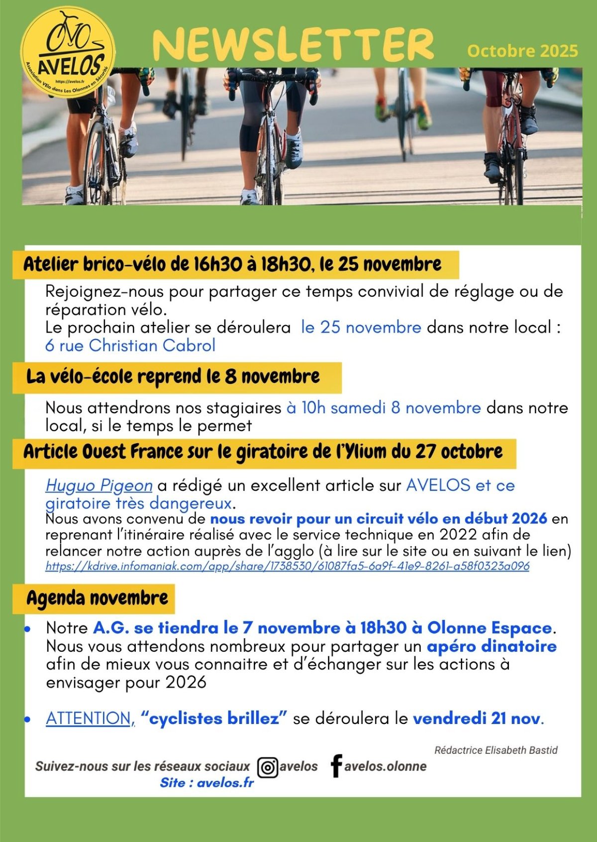 ACTUALITES Rendez-vous pour la vélo-école le 8 novembre à 10h au local. Rendez-vous pour l'atelier auto-réparation le 25 novembre de 16h30 à 18h30 au local.